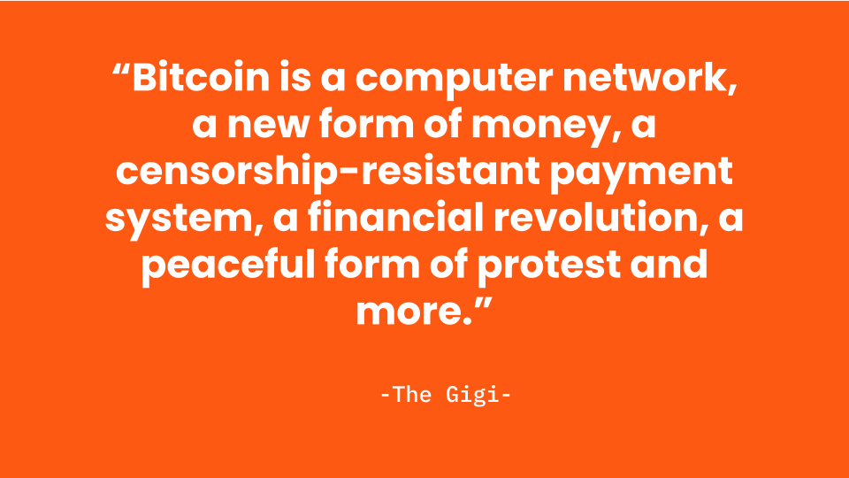 Bitcoin is so much more than a crypto coin. Bitcoin is a revolutionary technology that can reinvent our monetary system. As Gigi, author of 21 Lessons defines it: “Bitcoin is a computer network, a new form of money, a censorship-resistant payment system, a financial revolution, a peaceful form of protest and more.”