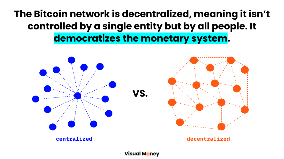 Bitcoin is a revolution! Bitcoin isn’t controlled by any specific entity, not a single government, company, or person—it operates through a decentralized network of users. It seeks to democratize the monetary system by reducing reliance on centralized authorities like governments.