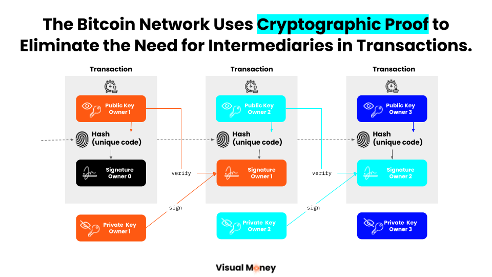 It decentralizes the problem of trust by requiring a network of nodes (computers run by sovereign individuals globally) to validate each transaction. A transaction is only validated and added to the blockchain (the ledger) if the network reaches consensus, meaning a majority of nodes independently agree that the transaction is valid. All transactions are public and visible to everyone on the blockchain, making tampering extremely difficult.