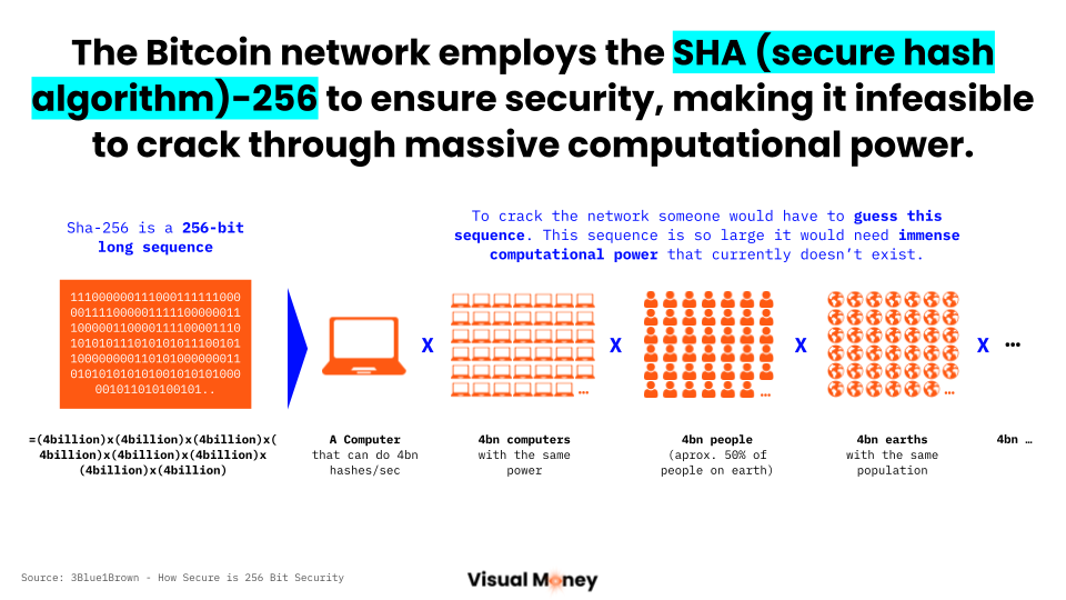The Bitcoin network prioritizes security over fast transactions. It is secured by the SHA-256 hash function, which generates a 256-bit long sequence, so large that it would require an enormous amount of computing power to crack. To get an idea of how large this number is and how difficult it would be to break, check out the video by 3Blue1Brown on YouTube (https://www.youtube.com/watch?v=S9JGmA5_unY), where the concept is explained in much greater detail.