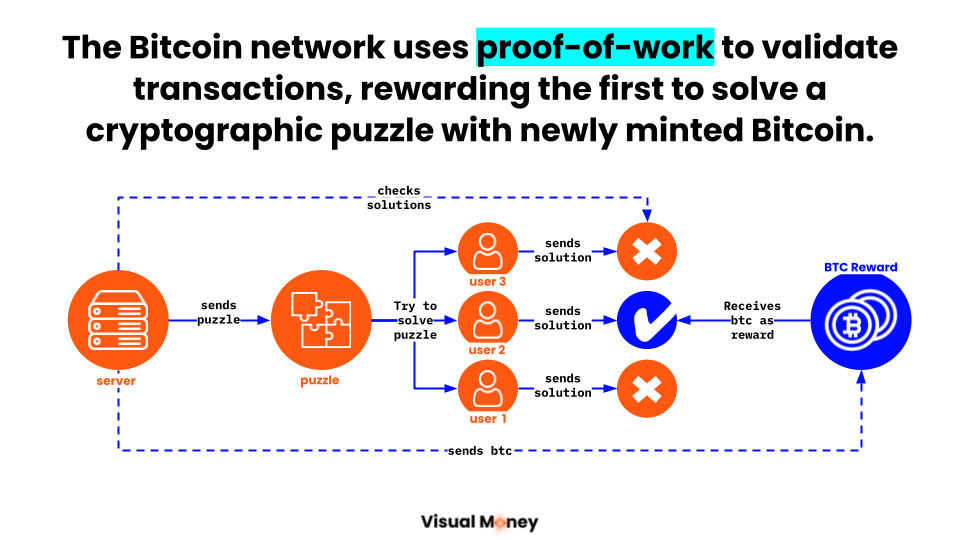 The Bitcoin network uses the proof-of-work mechanism, which, in short, means that to validate a transaction, members of the blockchain network must use computational power (work) to solve a cryptographic puzzle. The first to solve the puzzle is rewarded with newly minted Bitcoin.