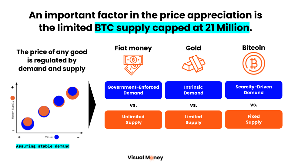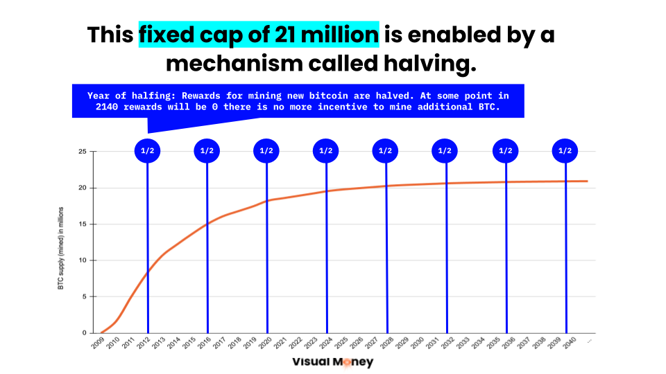 Bitcoin’s scarcity is one of its defining features, with a capped supply of 21 million BTC, which makes it one of the rarest digital assets and potentially a strong hedge against inflation. While commodities like gold are scarce and difficult to extract, Bitcoin’s supply is strictly finite, with a cap that cannot be exceeded. This finite supply is assured by its underlying protocol, which reduces the rate of new bitcoin creation through a process called halving. During the halving, the reward for mining new blocks is cut in half, which effectively decreases the rate at which new bitcoins are generated approximately every four years, ensuring that the total supply will never exceed 21 million BTC, as at some point the rewards will be 0. There will be no more incentive to mine new BTCs, as the cost of producing a new BTC will be higher than the reward.