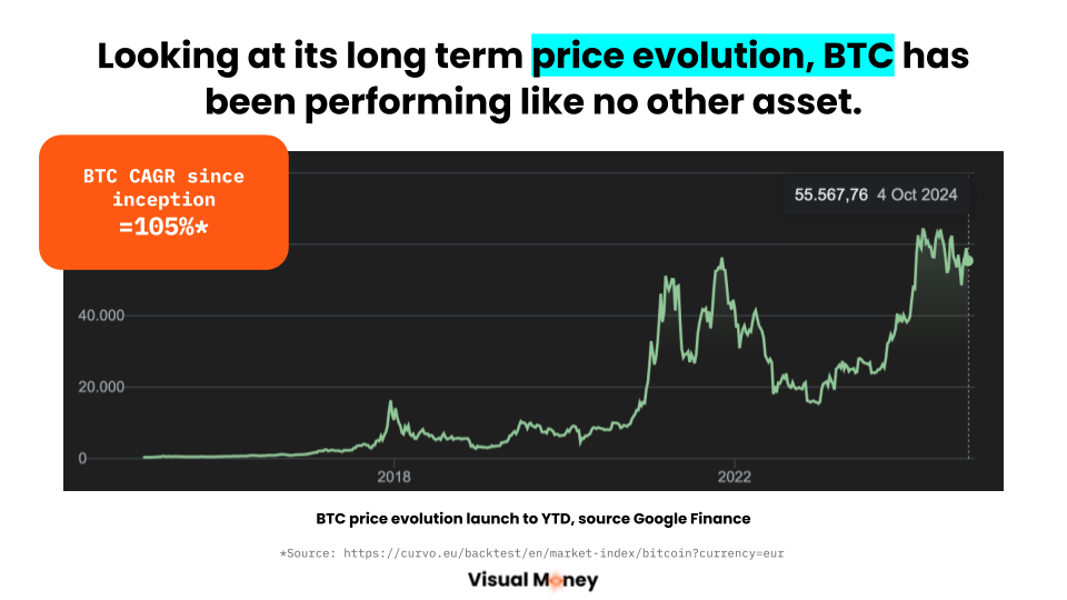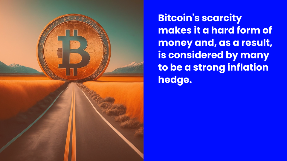 Bitcoin is considered by many to be a potential hedge against inflation, as it is one of the hardest forms of money currently available. As its adoption grows, it has also become an increasingly interesting investment asset due to its notable risk-return profile. While returns have shown an asymmetric pattern, historical value trends (and its Sharpe ratio) suggest that Bitcoin has outperformed many other assets over time. Although there have been fluctuations, the general trend has been upward, and some view the long-term risk of loss as relatively low if Bitcoin is held as a store of value. On the other hand, potential value appreciation has been projected by some to be substantial, with predictions ranging from 10x to 100x over the next decade, driven by its algorithm that continues to reduce new supply.