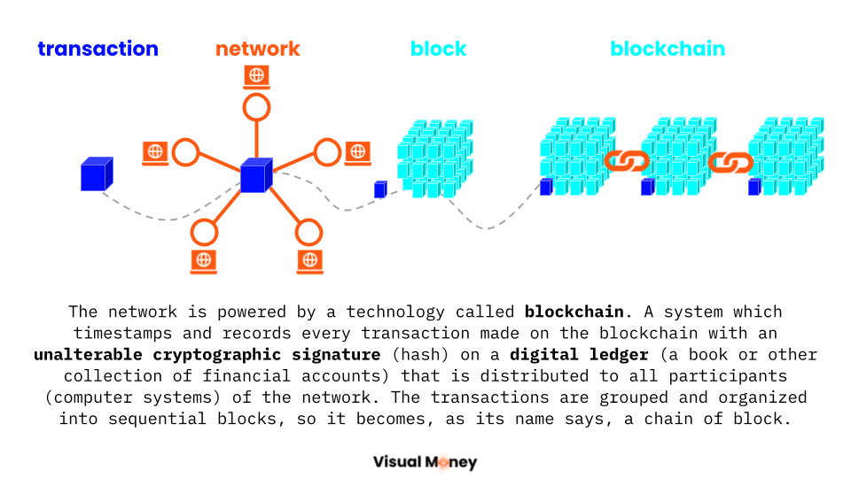 When we talk about Bitcoin we really talk about two things. First, there is the Bitcoin network, a protocol that doesn’t rely on trust but on mathematics and cryptography. This protocol is a peer-to-peer payment network (or system) that allows users to make transactions without a third-party intermediary like a bank, the government or financial service providers. The network is powered by a technology called blockchain. A system which timestamps and records every transaction made on the blockchain with an unalterable cryptographic signature (hash) on a digital ledger (a book or other collection of financial accounts) that is distributed to all participants (computer systems) of the network. The transactions are grouped and organized into sequential blocks, so it becomes, as its name says, a chain of block.