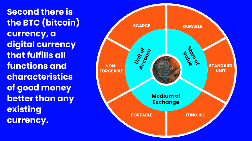 Second there is the BTC (bitcoin) currency, a digital currency that fulfills all functions and characteristics of good money better than any existing currency.