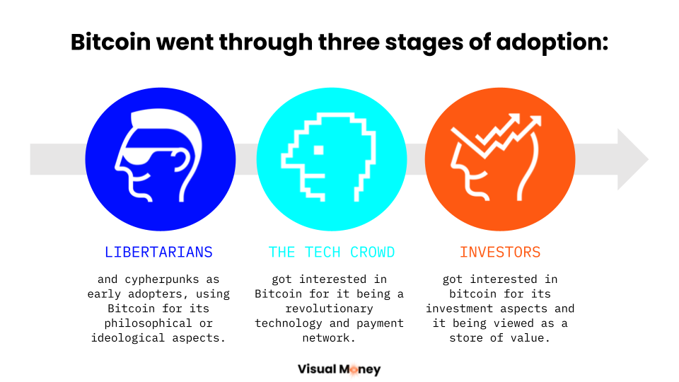 In its very early stages, it was first adopted by libertarians, cypherpunks and used to buy and sell substances and other illegal stuff on the online black market.1 We could say, that this group of early adopters, believed and started using Bitcoin for its philosophical or ideological aspects or well for its proprietaries as an anonymous medium of exchanges.
